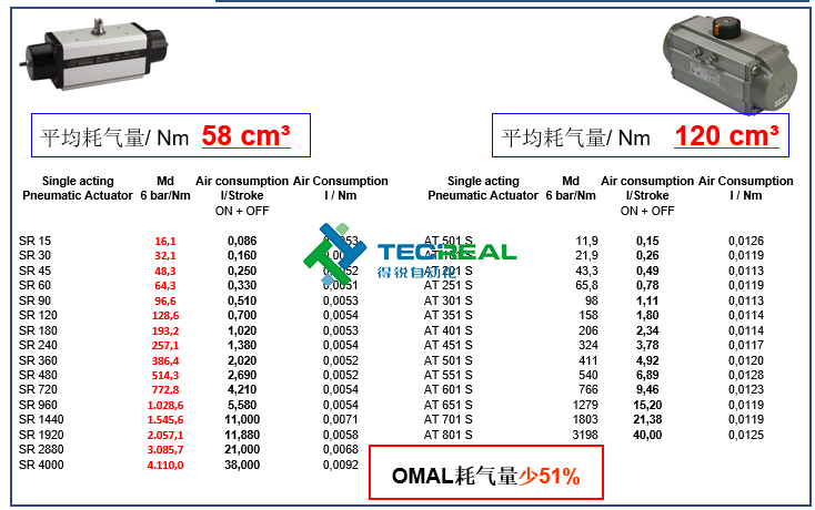 再看單動(dòng)型號(hào)的對(duì)比,OMAL的平均耗氣量/ Nm為58 cm3,Air Torque執(zhí)行器平均耗氣量/ Nm為120 cm3,從圖中可以看出OMAL的耗氣量比對(duì)方少51%。
