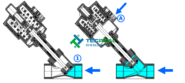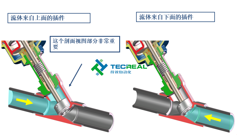 流體來自上面或下面的插件時角座閥的工作原理差別很大。