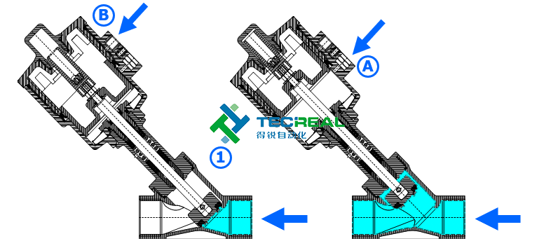 向執(zhí)行器供應(yīng)空氣(從端口(A))彈簧被壓縮,閥塞關(guān)閉閥門通道。