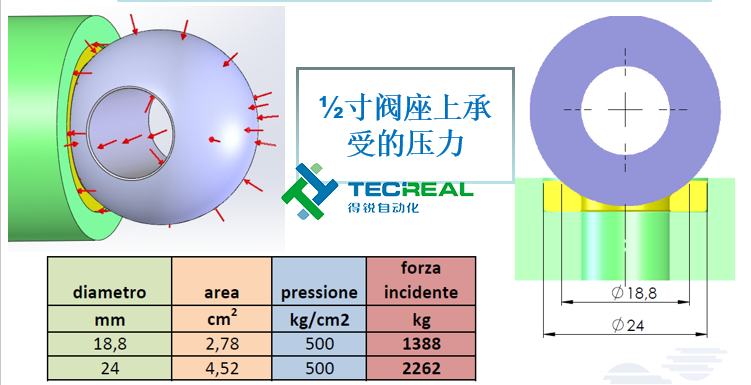 普通球閥的球芯作用在閥座的受力面積為2.78cm2,大力神球閥的閥座受力面積為4.52cm2, 能承受的壓力為2262kg。最重要的是閥座的材料,超乎尋常的是我們特殊的聚銑胺(尼龍)材料。