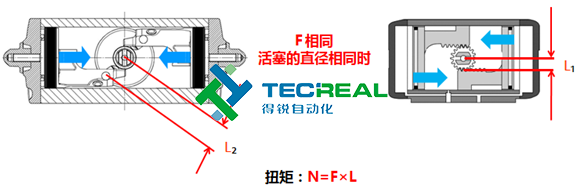 在執(zhí)行器的開啟的過程,撥叉式執(zhí)行器在軸轉(zhuǎn)動(dòng)0°、45°、90°輸出的力矩成線性,分別是最大輸出力矩的100%、50%、100%,而齒輪齒條式執(zhí)行器輸出力矩成直線,整個(gè)開啟過程都是一樣的。