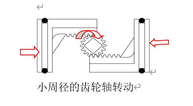 齒輪齒條式(多數(shù)廠家):齒輪與齒條因?yàn)橐獓Ш纤云浣Y(jié)構(gòu)為平行式結(jié)構(gòu),缸徑必須大于齒輪齒條分度圓之和,同時(shí),因?yàn)橐惺茌d荷沖擊,齒條厚度加大,因而結(jié)構(gòu)尺寸較大。