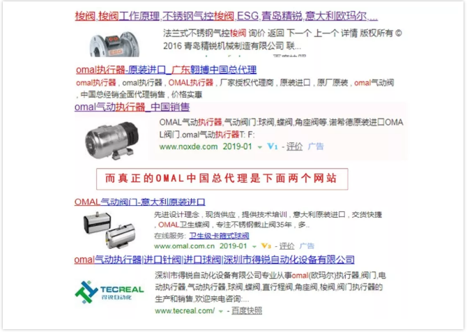 "樹大招風(fēng)”,自然會(huì)引起諸多企業(yè)的模仿,OMAL作為國際知名品牌,肯定會(huì)有不少人去某搜索引擎去查詢。然而我們發(fā)現(xiàn),有不少企業(yè)打著意大利OMAL的招牌,或者利用意大利OMAL做搜索關(guān)鍵詞。這些山寨閥門實(shí)在太過無法無天。