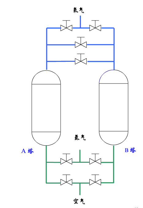 空氣經(jīng)空壓機壓縮后,經(jīng)過初過濾、除油、冷凍干燥后,在冷千機中去除大部分水分。干燥空氣進入空氣儲罐,經(jīng)過空氣進氣閥進入A吸附塔,A塔壓力升高,壓縮空氣中的氮分子被沸石分子篩吸附,未吸附的氧氣穿過吸附床,經(jīng)過A塔氧氣產(chǎn)氣閥進入氧氣緩沖罐,這個過程稱之為吸附,持續(xù)時間為幾十秒。
