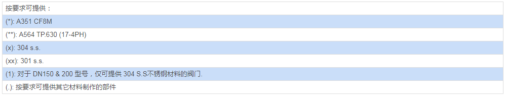 采用材料(用于閥體/活塞球/閥桿)與標(biāo)準(zhǔn)配置不同的參數(shù)要求,請(qǐng)與我們的銷售部門聯(lián)系